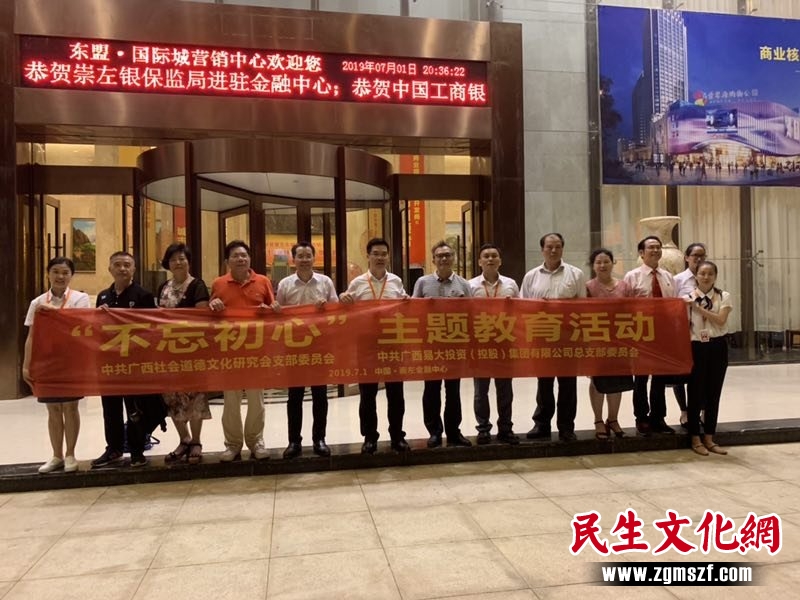 7月1日,是中国共产党成立98周年纪念日,广西社会道德文化研究会党支部组织党员10人到广西易大集团联合开展“不忘初心,牢记使命”七一党日座谈会,与该公司党总支党员一起,就如何不忘初心,开创事业发展问题,展开座谈讨论。易大集团是中国东盟金融中心的建设者,也是东盟金融贸易供应平台项目的建设者,本着弘扬实干、硬干、排出万难的道德精神,公司在短短6年时间实现拥有11家分公司,资产总值50亿元的集团企业。广西社会道德文化研究会党员专家对“易大精神”给予高度总结和评价。