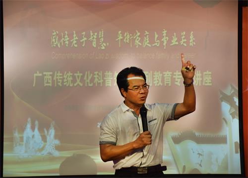 讲座由《文明崛起》的作者,广西社会道德研究会讲师团副团长潘赵主讲。潘先生开宗明义地指出,全面建成小康社会,实现中华民族伟大复兴,必须发挥文化引领风尚、教育人民、服务社会、推动发展的作用,建设优秀传统文化传承体系、弘扬中华优秀传统文化。而家庭是这个文化传承中的核心,是社会的细胞,家庭的和谐进步是社会和谐进步的基石。