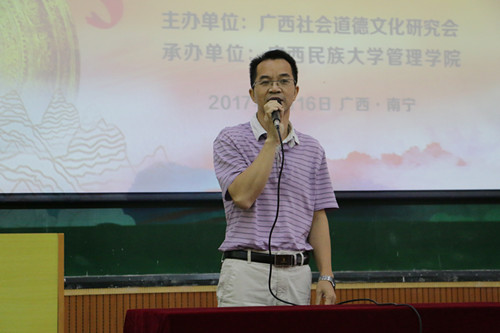 9月16日上午9:30时,由广西社会道德文化研究会主办,广西民族大学管理学院承办的2017年社会科学大讲坛“传播八桂文化,弘扬广西精神”广西精神文化根源专题讲座在广西民族大学管理学院综合楼报告厅举行。讲坛由《文明崛起》作者潘赵老师主讲,广西民族大学管理学院2017级全体新生近400名学生参加。