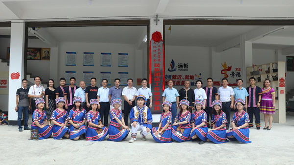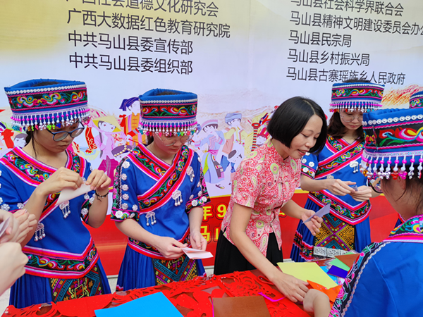 广西著名剪纸艺术家钟女士为古棠村送上象征民族团结的剪纸作品。