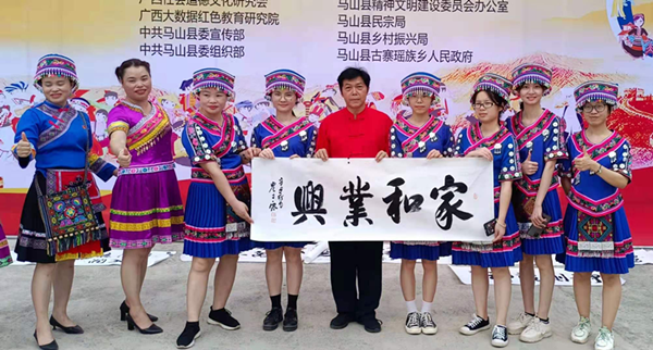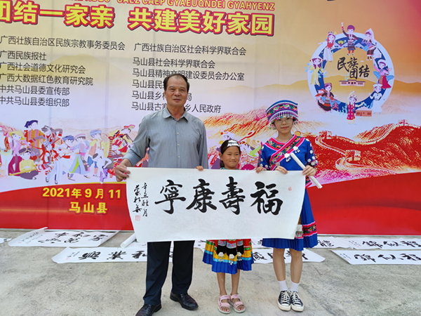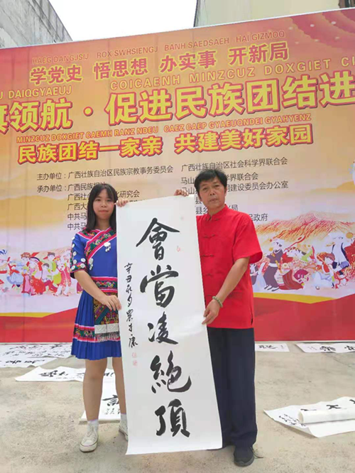 南宁老年书画摄影协会会员、广西社会道德文化研究会民族书画委员会副主任农才康为瑶族群众书写作品。