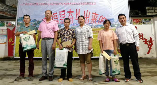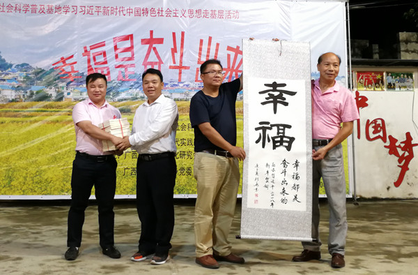 活动期间,广西社会道德文化研究会给大化县贡川乡政府赠送书法和道德科普读物,会员企业为三个贫困家庭赠送慰问品及慰问金。