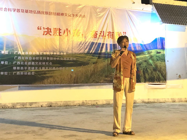 那坡县平孟镇北斗新农村建设理事会秘书长黄建忠发表了热情洋溢的欢迎辞,并用当地的山歌表达了边境居民的热情好客。广西社会道德文化研究会监事长吕翠英进行主题宣讲。她用当年自己参军下乡到那坡的故事拉近了群众感情,大家在轻松愉快的氛围中体会到边境地区经济社会发展已经是今非昔比,今年是那坡县脱贫摘帽之年,需要大家冲刺最后一公里。吕翠英用饱满的热情、慷慨激昂的话语、鲜活的故事,深情讲述了身边优秀人物在决胜全面小康、决战脱贫攻坚、抗击疫情攻坚战斗中发生的感人故事,描绘了普通“奋斗者”的生动形象,“团结是铁,团结是钢,团结就是力量”,精彩的宣讲赢得在场观众的阵阵掌声。在场群众纷纷表示,今年是全面建成小康社会、决战脱贫攻坚的收官之年,在这个伟大进程中,离不开每个人的拼搏与奋斗,将以先进人物为榜样,坚定信心克难关、同心同德奔小康。