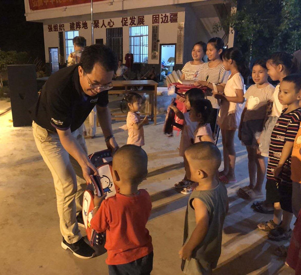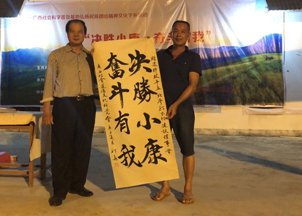 广西社会道德文化研究会书画艺术委员会主任蒙新华为群众现场泼墨,广西那坡商会会员企业雅斯特酒店店长黄海云、天天影院院长陈梦婷,广西社会道德文化研究会蓝梓宁为北斗屯12户贫困户发放了慰问金。