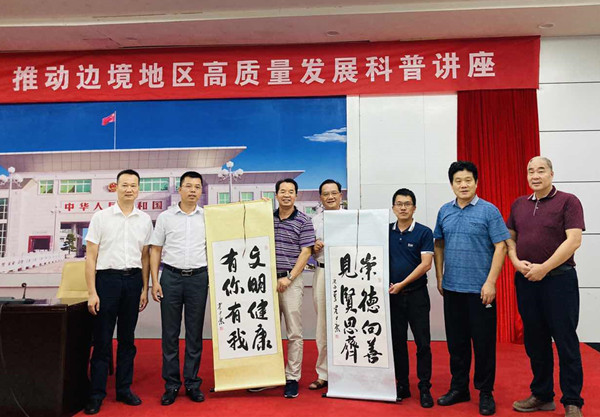 广西社会道德文化研究会领导给东兴市委常委、宣传部东兴社科联赠送书法作品