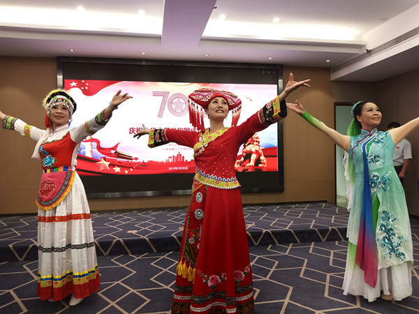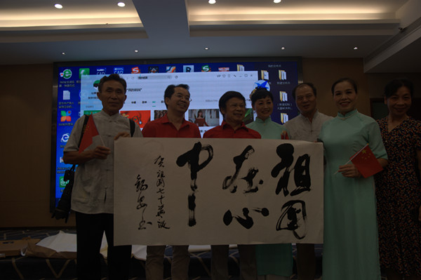 9月30日下午,广西社会道德文化研究会为庆祝中华人民共和国成立70周年文艺活动在南宁怡程酒店举行,来自研究会80多名艺术家会员参加活动,大家以歌舞、诗朗诵、书法表演等形式表达对祖国的祝福!