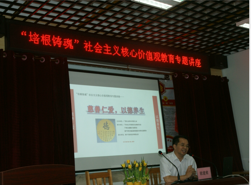 讲座由广西社会道德文化研究会会长、全国优秀社会科学普及专家欧建雍主讲,他以“慈善仁爱,以德养生”为主题,阐述中华优秀传统道德文化蕴含的社会主义核心价值观思想,以及这种优秀传统文化对人们日常生活的修为影响。重点向大家介绍“德”何以养生?为什么现代人感觉到“道德滑坡”?新时代人该如何养“德”?等几个方面的问题。